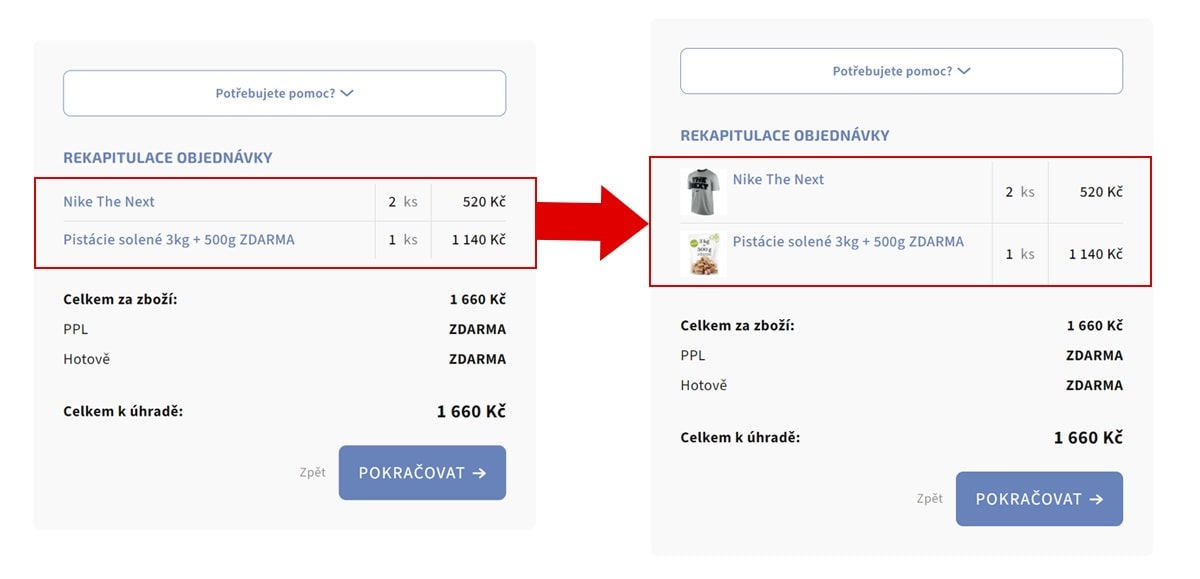 Zpřehledněte svým zákazníkům rekapitulaci objednávky ve 2. a 3. kroku - nenuťte je se vracet na detail produktu či do nákupního košíku, aby si ověřili, že mají opravdu to co chtěli. S každým opuštěním nákupního procesu se zvyšuje riziko nedokončení objednávky! Zákazník se často rozhoduje mezi více produkty a ne vždy si pamatuje přesný název toho, pro co se rozhodl. V současném stavu se v objednávkovém procesu ve 2. a 3. kroku zobrazují pouze názvy produktů s proklikem na detail produktu - s tímto doplňkem kromě názvů zákazníci uvidí také náhledové fotografie produktů a budou mít větší jistotu o tom co se chystají závazně objednat - nejsou tedy kvůli kontrole nuceni se nikam vracet.